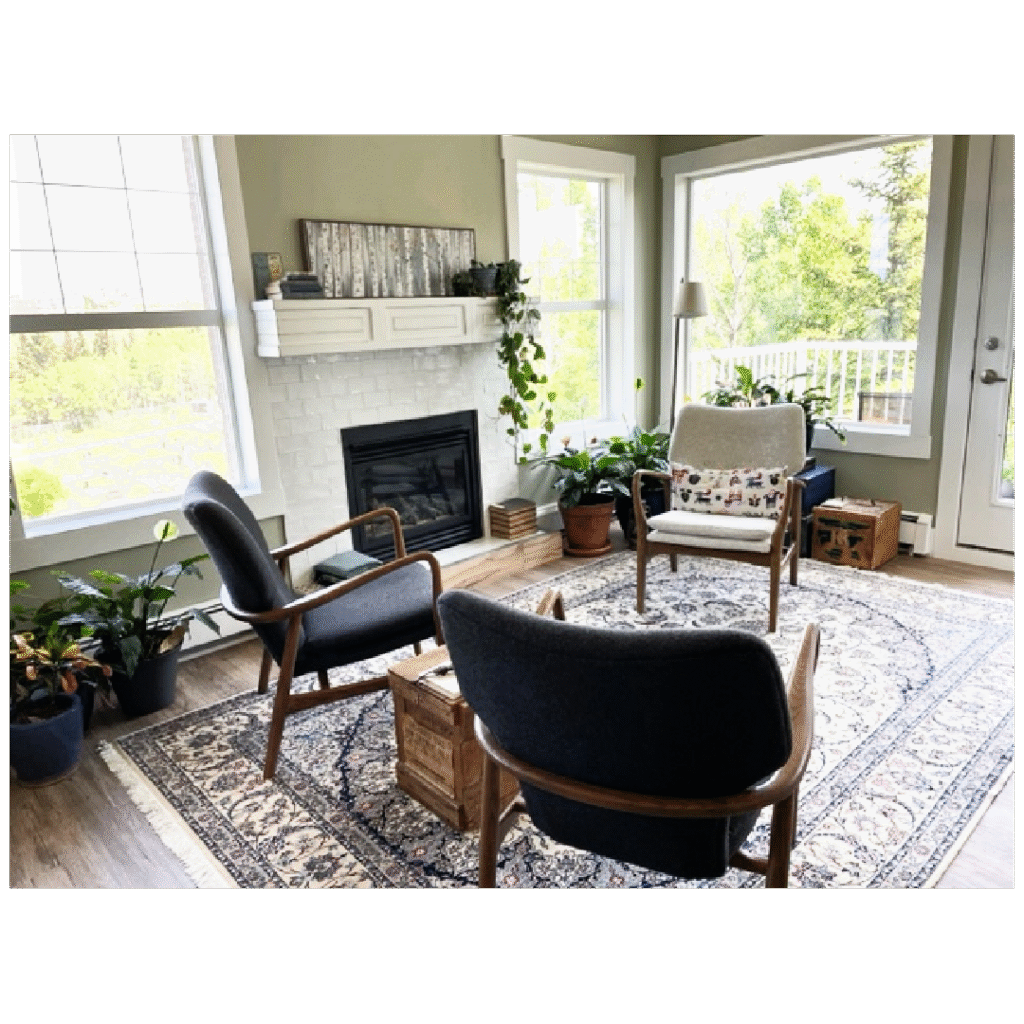 If in-person is your preferred space, you are welcome to our session space in Cochrane, Alberta on Treaty 7 land.* This is where Still Lake offers one-on-one and small group sessions. You’ll find soft chairs, hot tea (or cool water), and peaceful views. Warning: the birds get a little noisy around here, so you may have a little competition in your session.